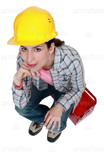 Рабочая сидит на ящике для инструментов