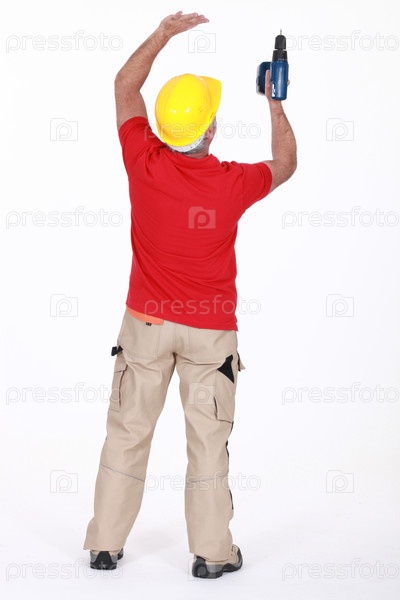 Разнорабочий сверлит на потолке