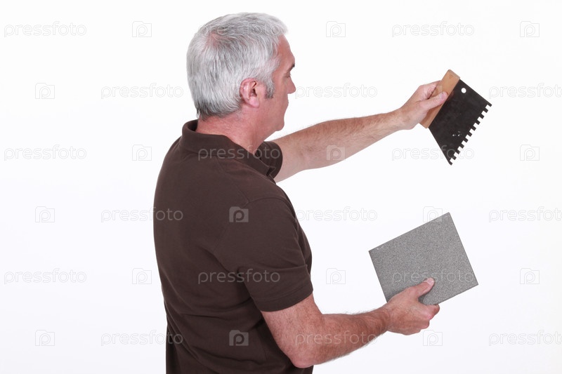Рабочий держит плитку и инструмент