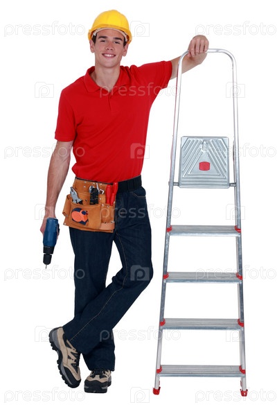 Рабочий со стремянкой и дрелью
