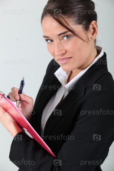 Брюнетка с планшетом и ручкой