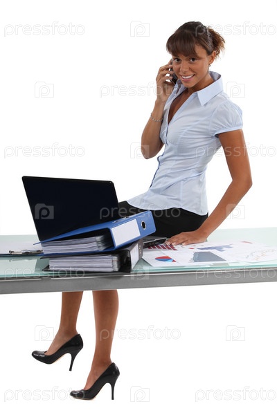Женщина сидит на столе в офисе