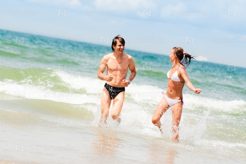 Молодая счастливая пара в океанских волнах
