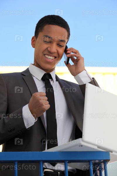 Радостный бизнесмен говорит по телефону