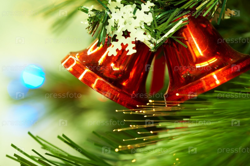 Близкий план красных игрушечных колокольчиков, висящих на зеленой ветке елены, украшенной бумажной снежинкой
