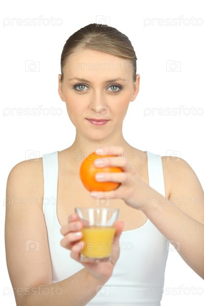 Молодая женщина выжимает апельсин