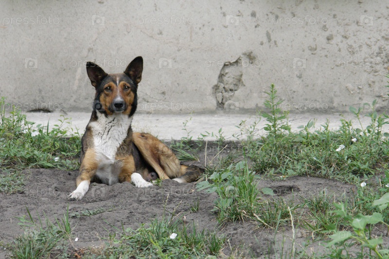 Бездомная собака лежит на земле