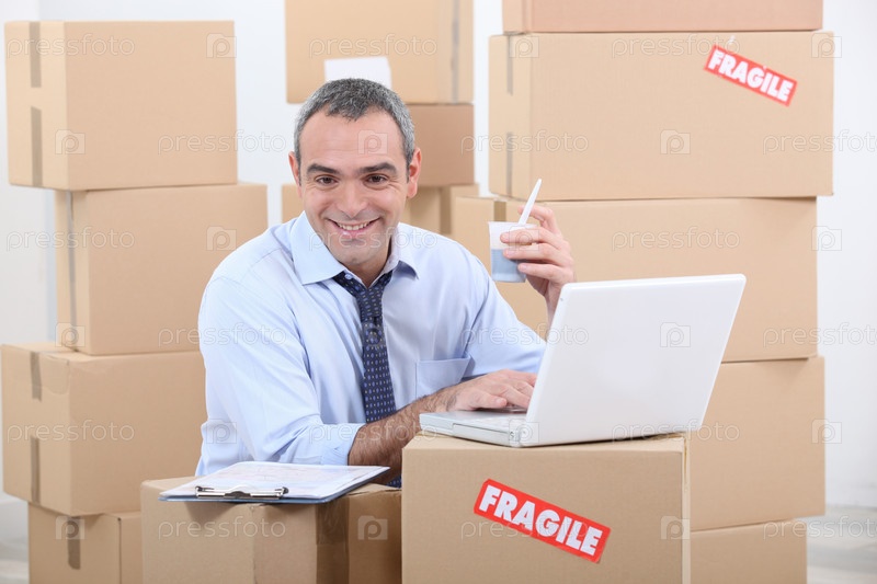 Деловой мужчина с компьютером среди картонных коробок