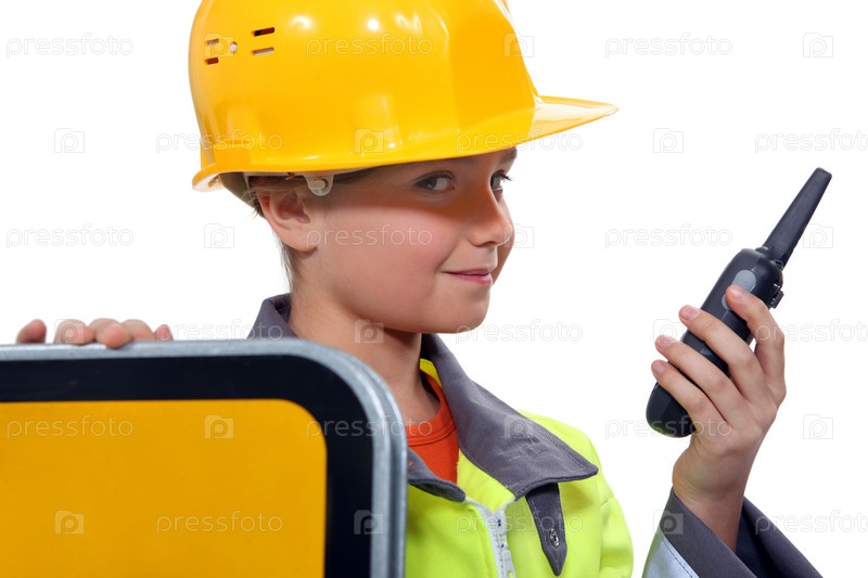 Маленький ребенок с рацией, одетый как дорожный рабочий