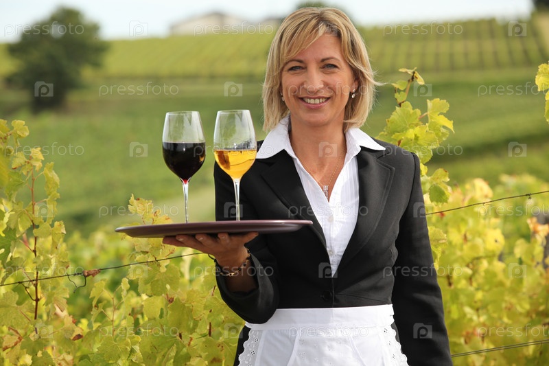 Женщина подает красное и белое вино на винограднике