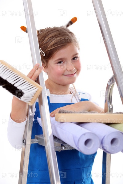 Маленькая девочка с лестницей и обоями