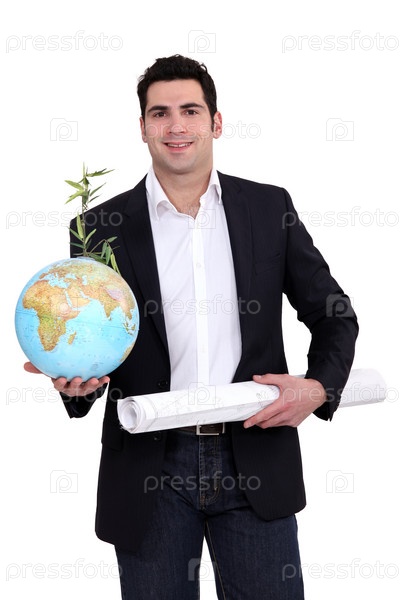 Архитектор с чертежами и глобусом