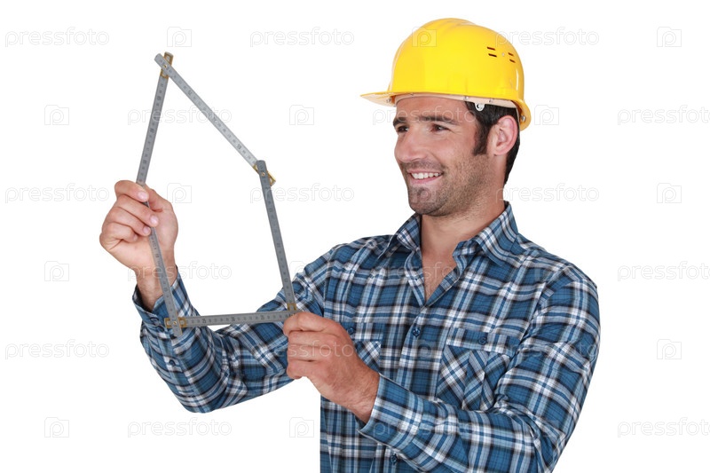 Рабочий образует дом из рулетки