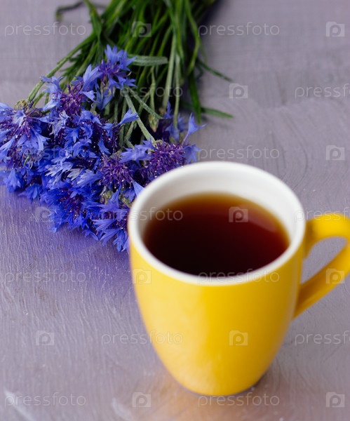 Желтая чашка чая и букет васильков