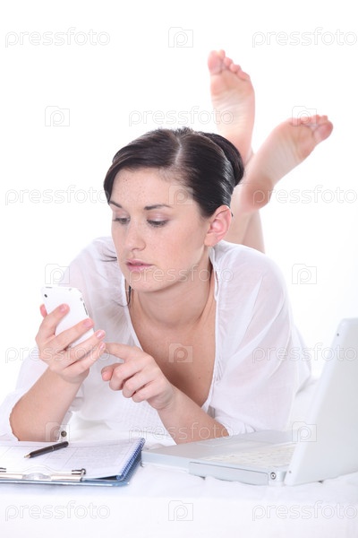 Лежащая женщина с компьютером и телефоном