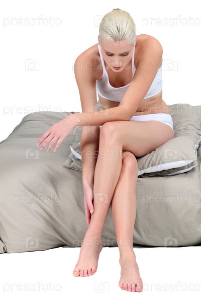 Блондинка в белье сидит на кровати