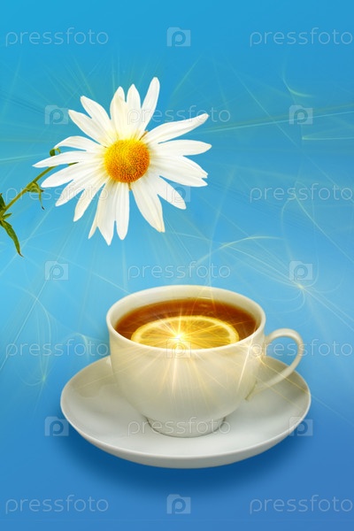 Кружка с чаем и лимоном на голубом фоне с цветком