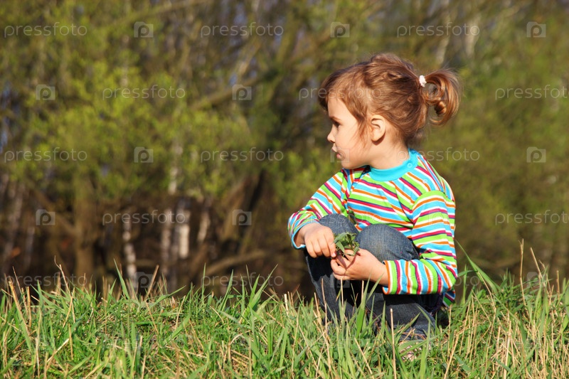 Маленькая девочка с травой в руках сидит на краю леса