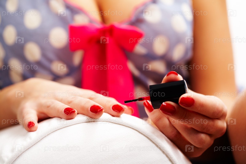 Близкий план женщины, полирующей ногти красной лакой