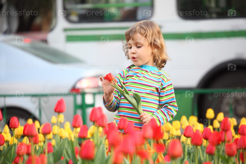 Маленькая девочка в полосатой футболке и тюльпаны на улице