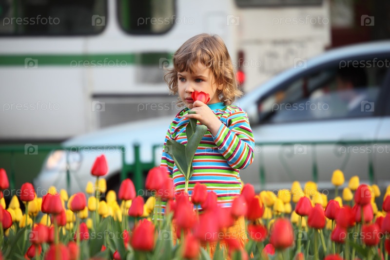 Маленькая девочка в полосатой футболке и тюльпаны на улице