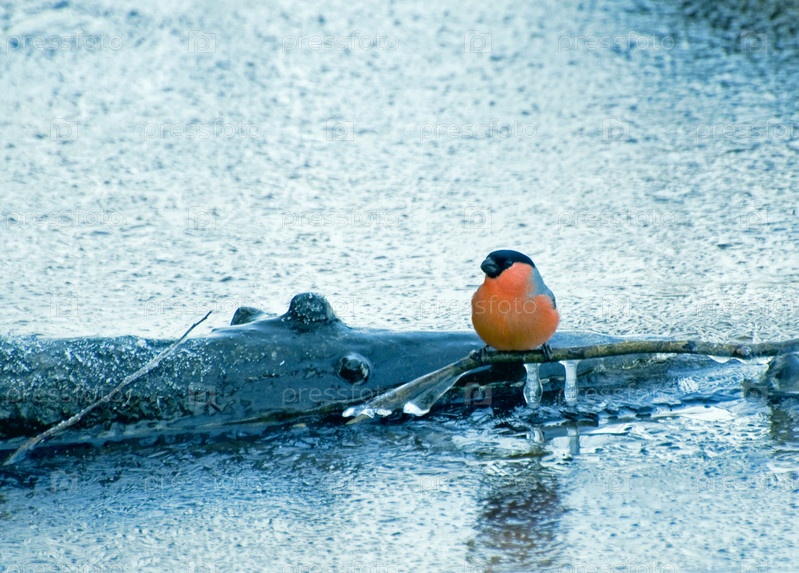 Снегирь на закованной льдом реке