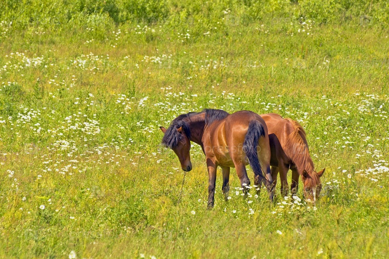 Две, прижавшиеся боками, лошади пасутся на лугу