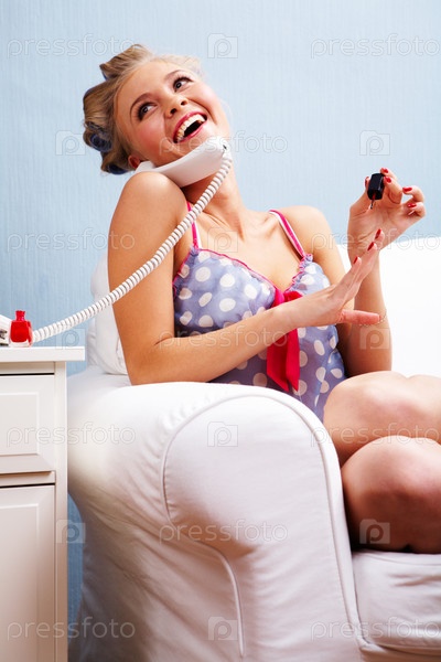 Портрет женщины в крюкерах, полирующей ногти и разговаривающей по телефону