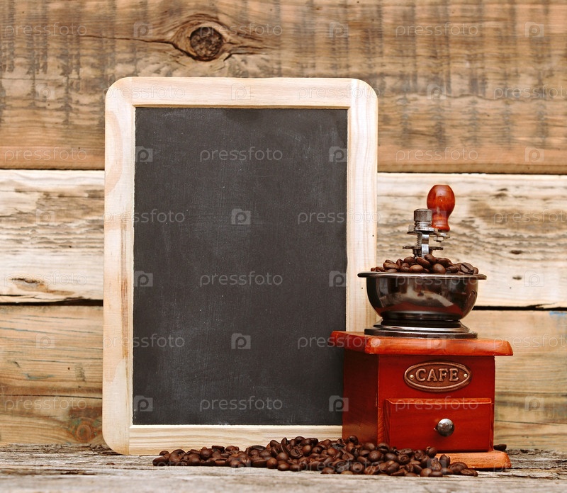 Кофемолка и пустая доска на деревянном фоне