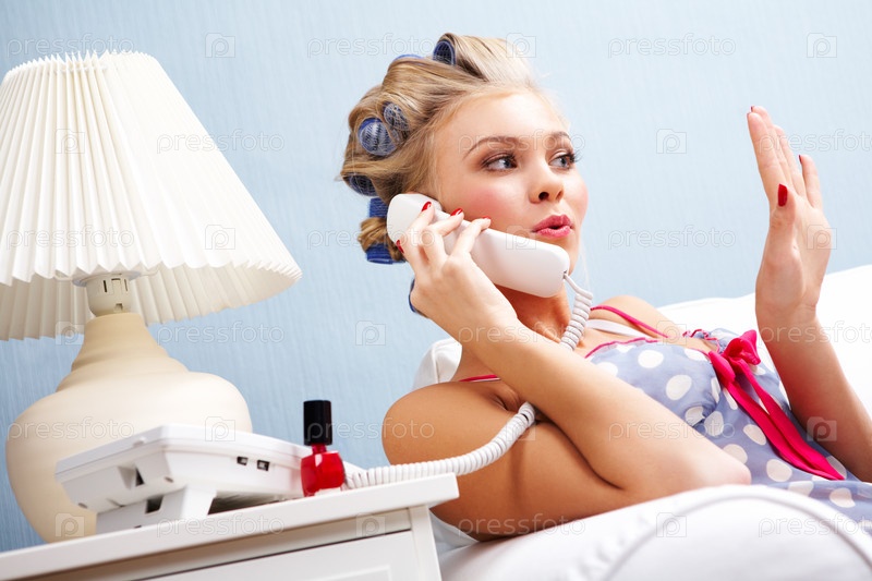 Портрет женщины в крюкерах, полирующей ногти и разговаривающей по телефону