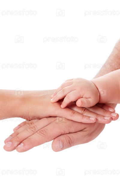 Руки родителей и ребенка на белом фоне