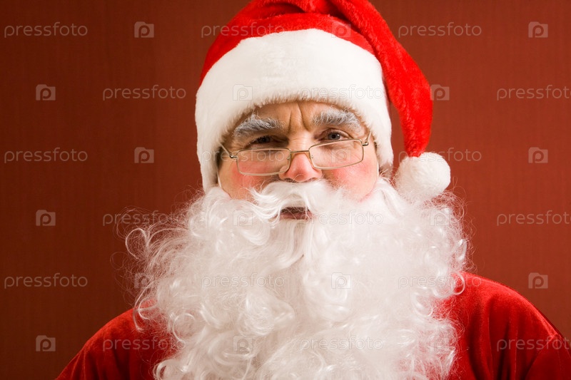 Фото счастливого Санта-Клауса в очках, смотрящего на камеру