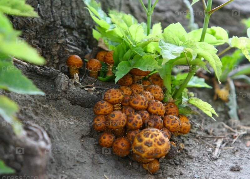 Грибы растут у корней пня
