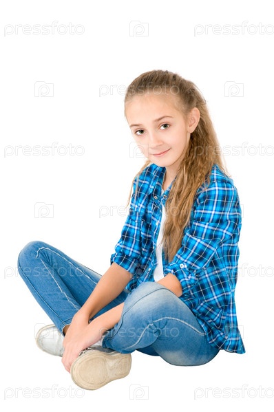 Девочка в джинсах и клетчатой рубашке