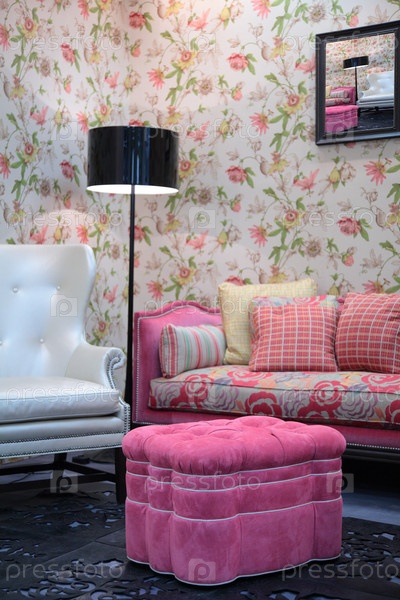 Розовый пуф в гостиной