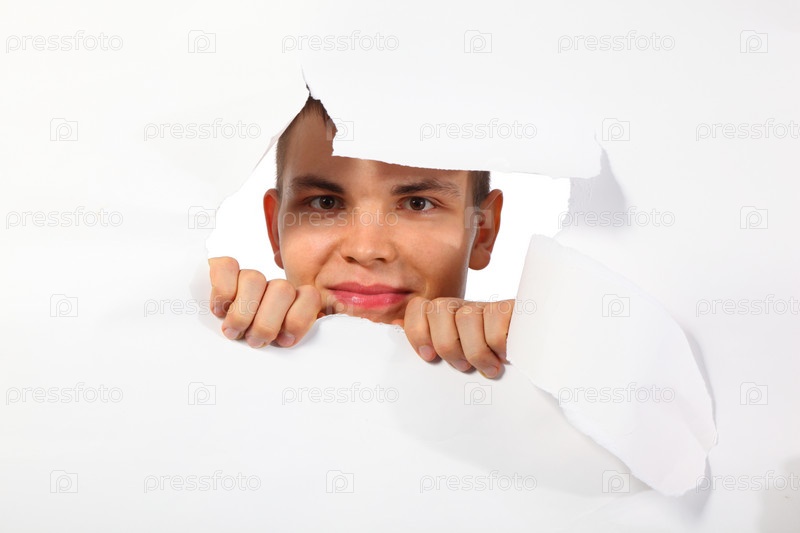 Портрет молодого человека, смотрящего через дыру в бумаге
