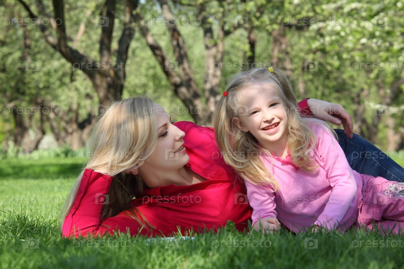 Мать и дочь лежат на траве в парке