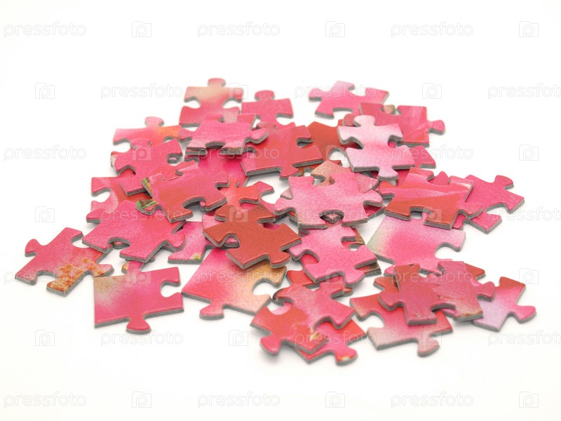 Куча деталей паззла на белом фоне