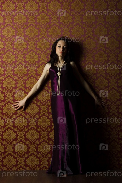 Хорошенькая девушка в бордовом платье стоит в студии