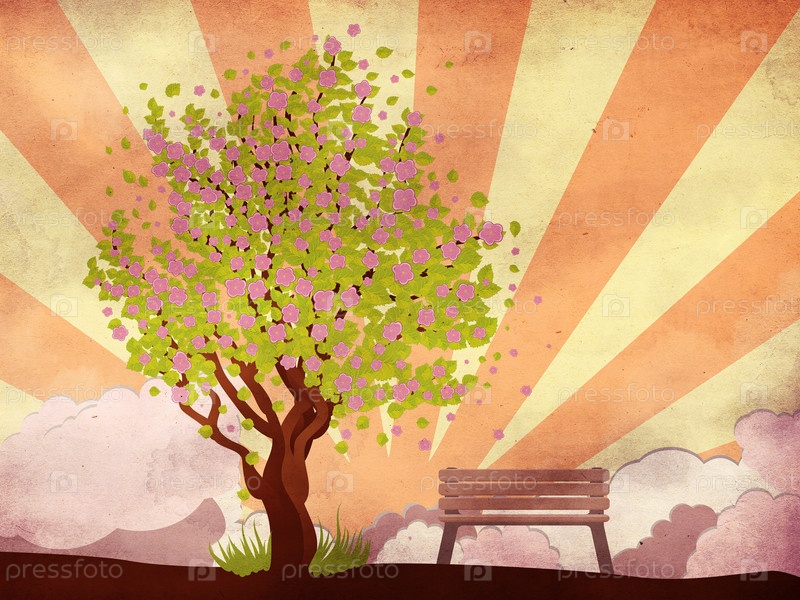 Сакура и скамейка на гранжевом фоне