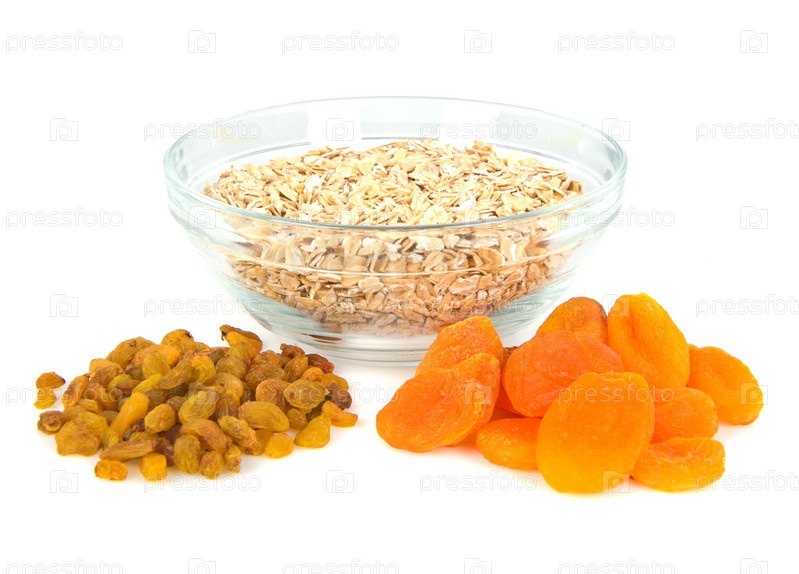 Овсяная каша в стеклянной миске и сухофрукты