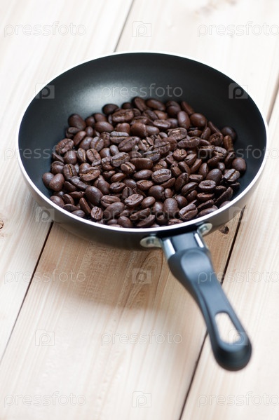 Сковорода с обжаренными кофейными зернами на деревянных досках