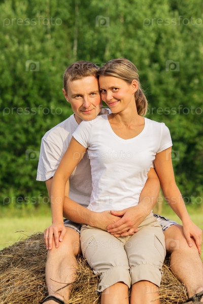 Молодая пара на стоге сена