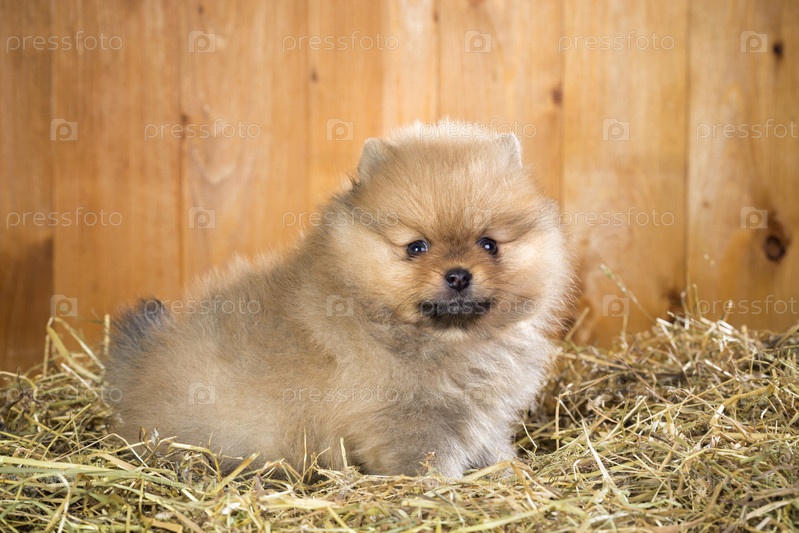 Щенок померанского шпица на соломе
