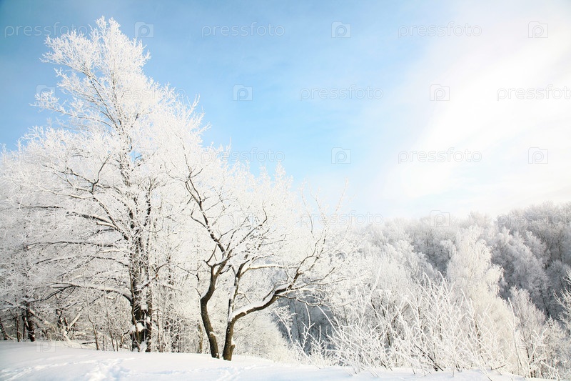 Красивый снежный лес на фоне голубого неба