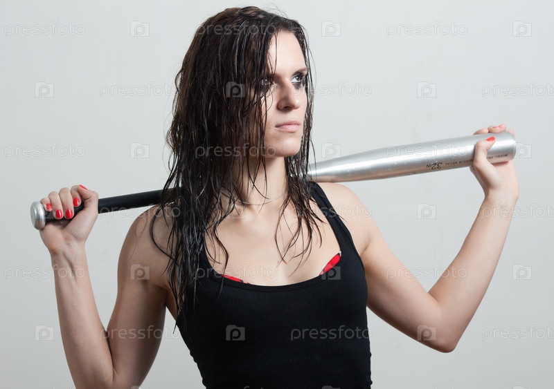 Мокрая женщина хулиган держит бейсбольную биту на белом фоне