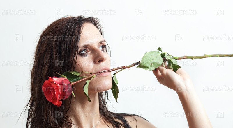 Лицо женщины с каплями воды и красной розой