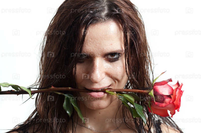 Лицо женщины с каплями воды и красной розой