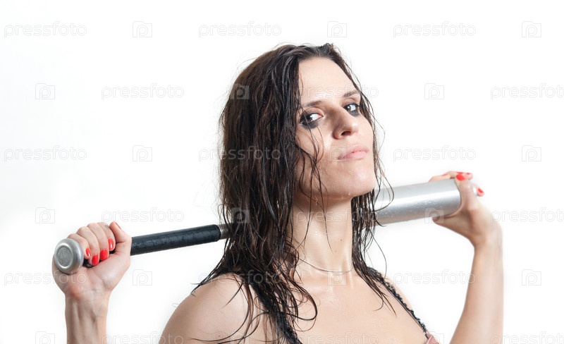 Мокрая женщина хулиган держит бейсбольную биту на белом фоне