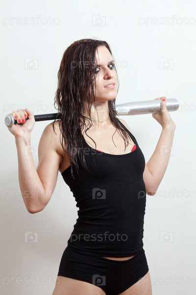 Мокрая женщина с бейсбольной битой